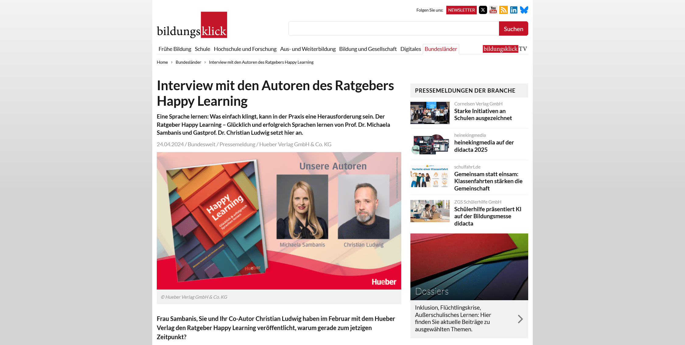 Im aktuellen Interview mit Michaela Sambanis und Christian Ludwig, den Autoren des Ratgebers Happy Learning, erfahren Sie, was der Ratgeber bietet, an wen er sich richtet und warum er gerade jetzt relevanter denn je ist. Das vollständige Interview steht hier zur Verfügung.
